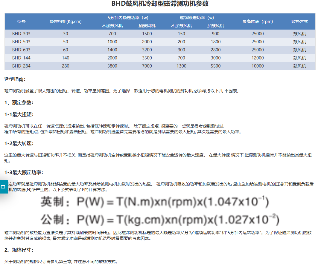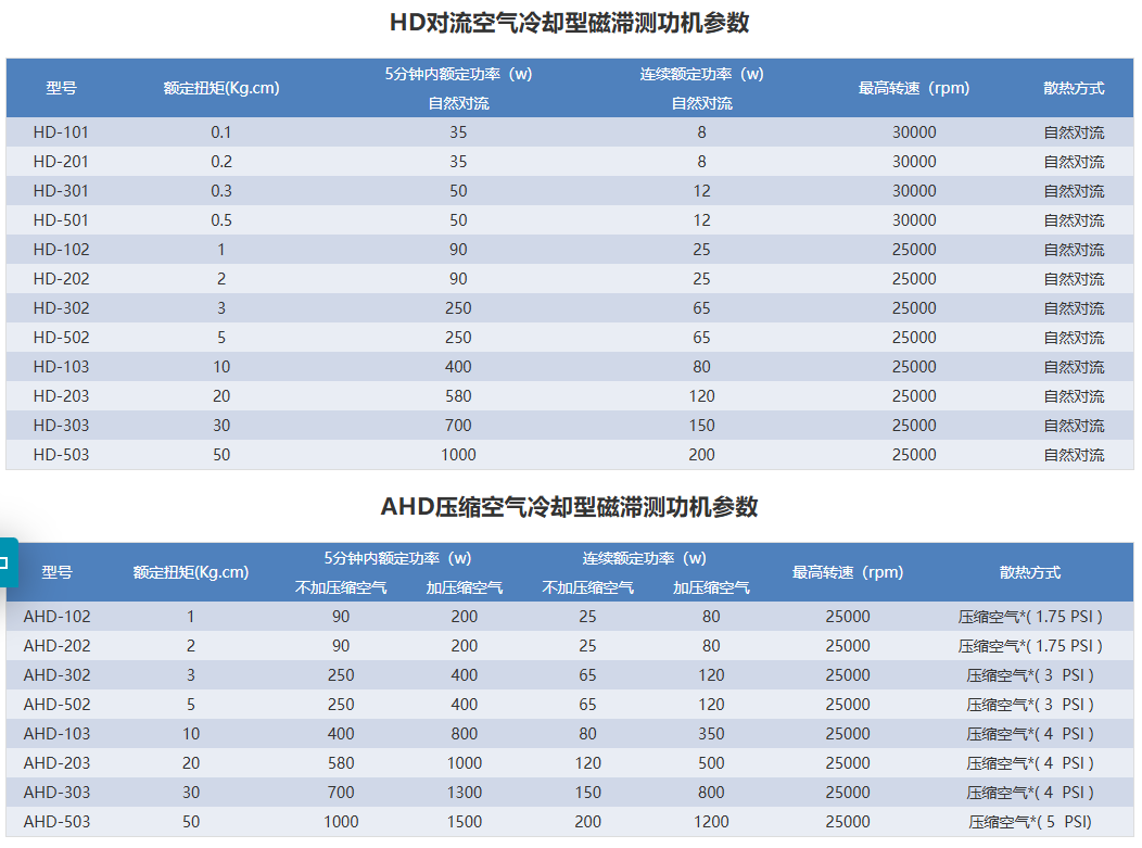 磁滞式测功机(HD/AHD/BHD系列)对于低中等功率的测试是通用和理想的。磁滞式刹车不需依靠速度来产生扭力,因此可以进行从无载到堵转的全程测试。刹车冷根据型号是由对流冷却(无风源)或空气冷却(压缩空气AHD系列或鼓风机BHD系列)提供,磁滞式测功机有连续性的和短时间散发更多热量能力的间歇性功率范围。根据测功机的大小和系统组成,其精确度为满刻度的±0.25%到±0.5%。同时也提供对于高速电机测试的特殊设计。使用于各种交直流电机的性能测试 (扭矩,转速, 功率等), 被广泛应用于汽车马达,家用电器马达, 电工具马达,压缩机电机及航空电机的检测。磁滞测功机适用于低到中等功率的电机测试,扭矩变化不受转速的影响, 因此可以进行从空载到堵转的全程测试。 根据冷却 方式的不同, 我公司生产的磁滞测功机分为三种类型: